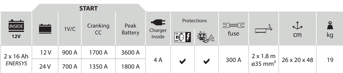 Its two high-quality internal batteries (ENERSYS: 2 x 16 Ah) give the STARTPACK 12.24 CI a high starting current (up to 3600 A peak).